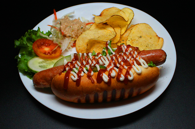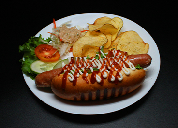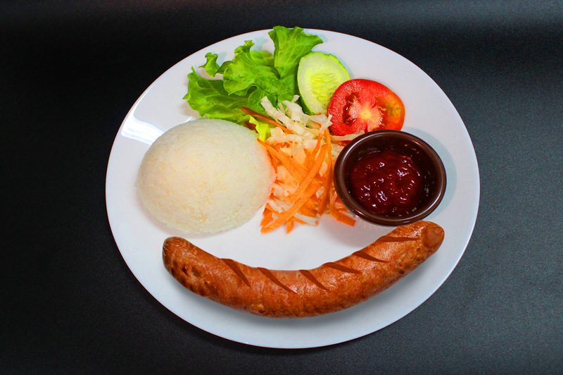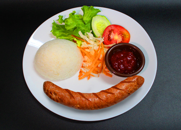 Juicy beef sausage served with rice and salad