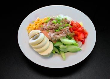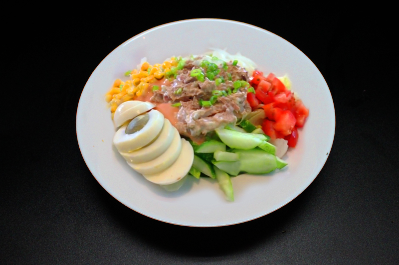 served with tuna chunks, boiled egg, and Gramps’ signature