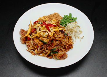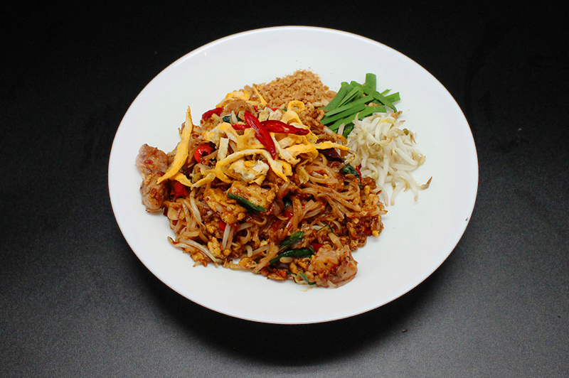 A Thai famous stir fried rice noodle with chicken, bean