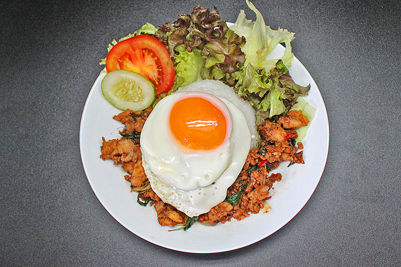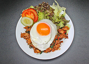 Tender chopped chicken stir-fried with onion, chili, and basil